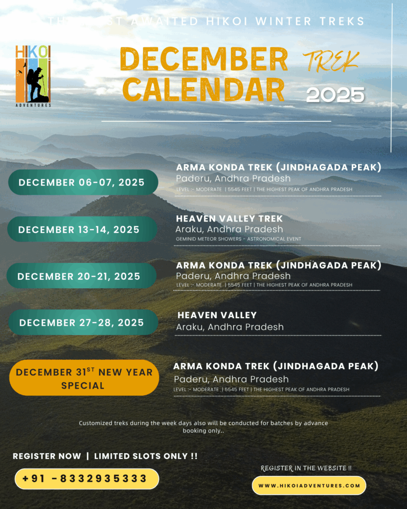 EXCELLENT Based on 277 reviews Posted on PAVAN KUMAR PERURITrustindex verifies that the original source of the review is Google. GoodPosted on Kiran KumarTrustindex verifies that the original source of the review is Google. Timing,caring, guiding, fun etc everything superPosted on Tilak NimmagaddaTrustindex verifies that the original source of the review is Google. Grateful to the Hikoi team for an unforgettable experience, and I highly encourage all trekking enthusiasts to explore it during the winter season.Posted on Rajani NelakuditiTrustindex verifies that the original source of the review is Google. Trek to Armakonda highest peak in Eastern Ghats.. unforgettable experience.. Thanks to Hikoi adventures.. perfect guidence & caring..Posted on RAJENDRA RAO MADIREDDYTrustindex verifies that the original source of the review is Google. Best trip ever in my lifePosted on Arvind GaneshTrustindex verifies that the original source of the review is Google. Had a stress-free trek to Arma Konda. Highly recommend. Looking forward to more in future.